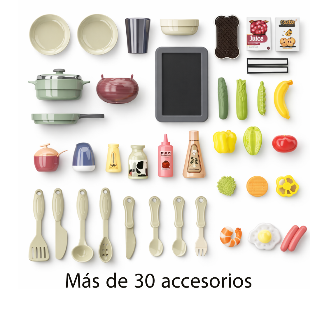 Incluye accesorios súper completos: frutas, ollas, sartenes, cucharones, utensilios y más, para que los niños puedan jugar con todo lo necesario.