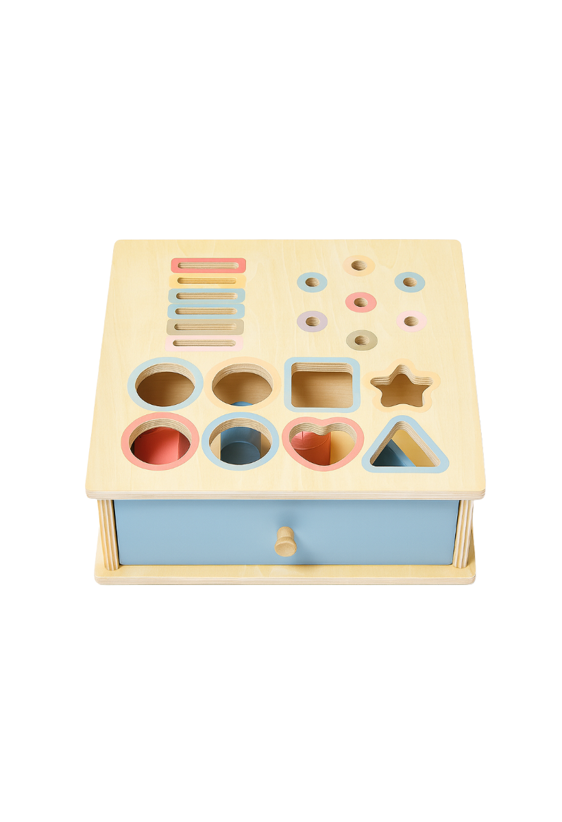 Fabricada en madera natural con acabados suaves y colores pastel, esta caja invita a explorar, encajar y clasificar figuras geométricas, discos, varillas y pelotas de diferentes tamaños.