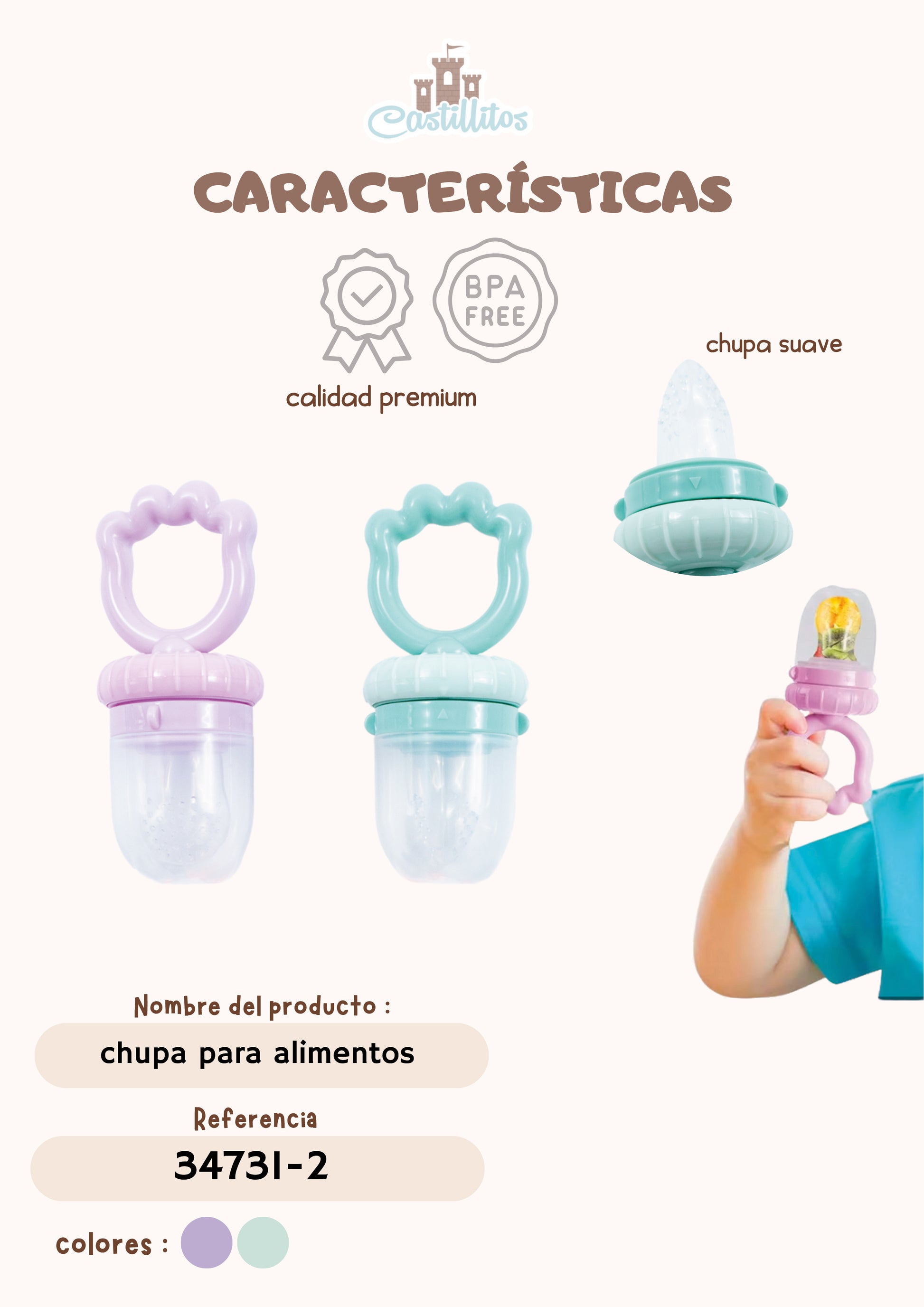 Innovador chupo diseñado especialmente para la fruta de bebé, ideal para introducir alimentos saludables de forma segura y divertida . Hecho de silicona suave, fácil de limpiar y resistente. ¡Ayuda a tu bebé a disfrutar de la fruta de manera divertida y segura!